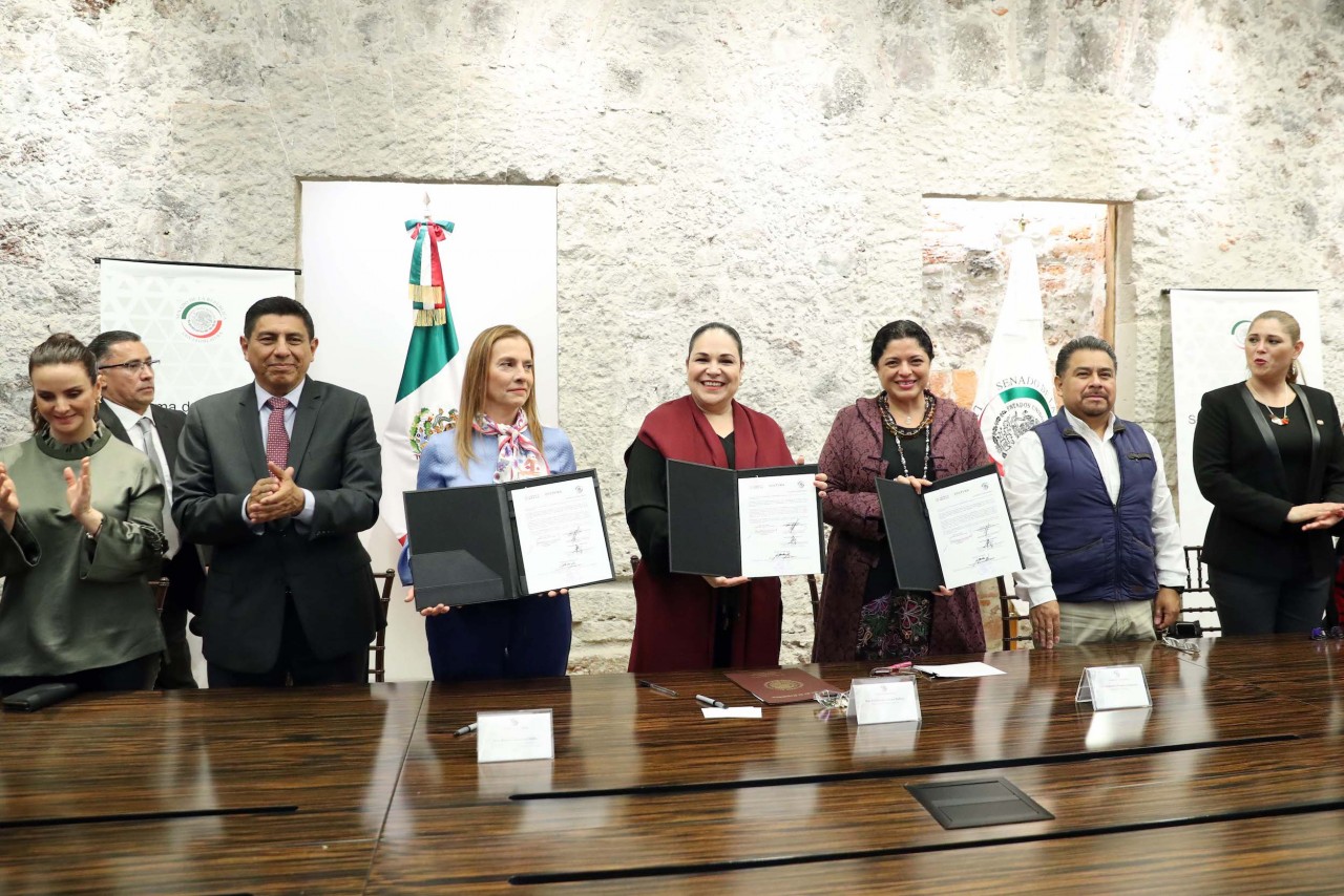 El documento fue signado por la presidenta de la Mesa Directiva del Senado, Mónica Fernández Balboa; la titular de la Secretaría de Cultura del Gobierno Federal, Alejandra Frausto Guerrero; como testigo de honor, estuvo la presidenta del Consejo Asesor Honorario de la Coordinación de Memoria Histórica y Cultural del México, Beatriz Gutiérrez Müller.